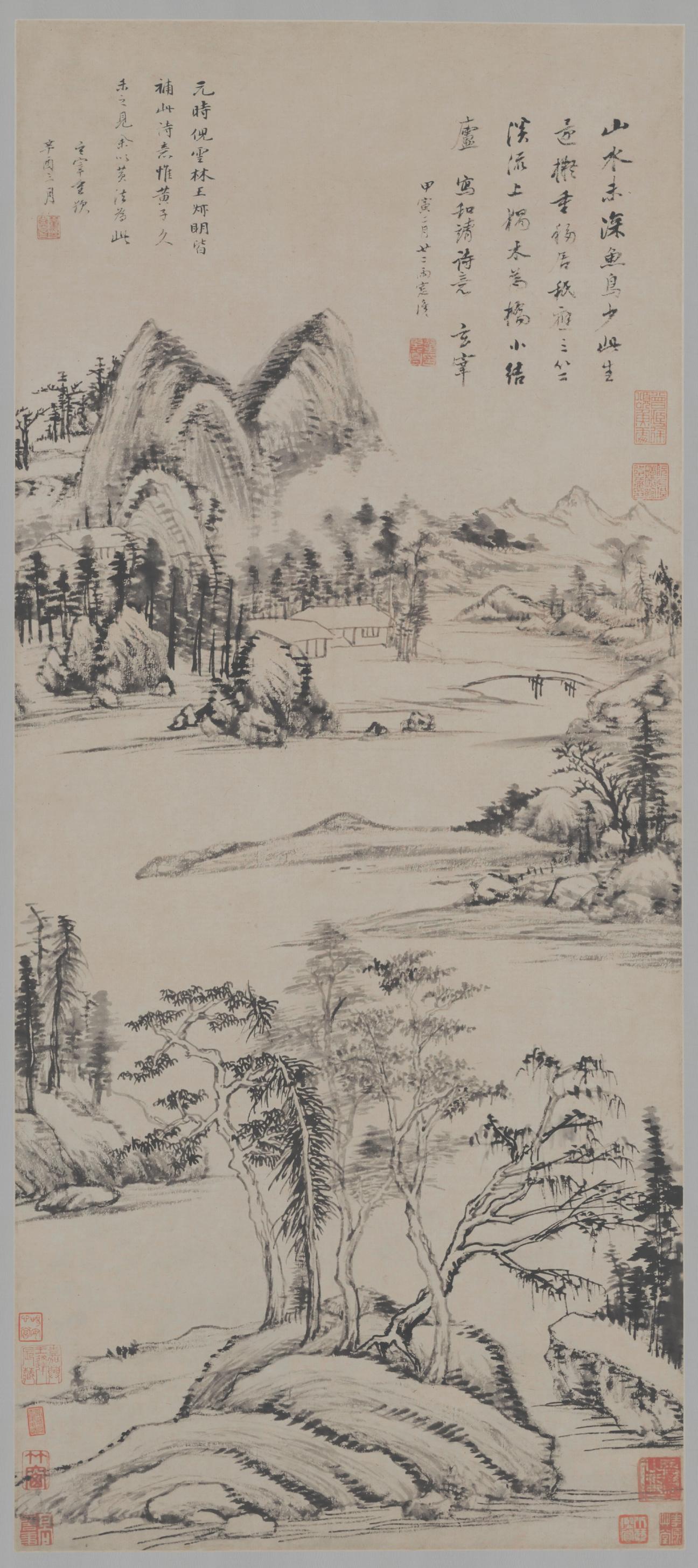 他的山水,并非对自然的简单描摹,而是心灵的投射,是精神的栖息地。你看那起伏的山峦,并非雄奇险峻,却有着一种温润的质感,仿佛可以感受到山间的清风拂面,听到溪水潺潺。那散落在山间的树木,姿态各异,有的挺拔,有的婀娜,有的则静静地伫立着,像一位位智者,默默地守护着这片宁静的世界。