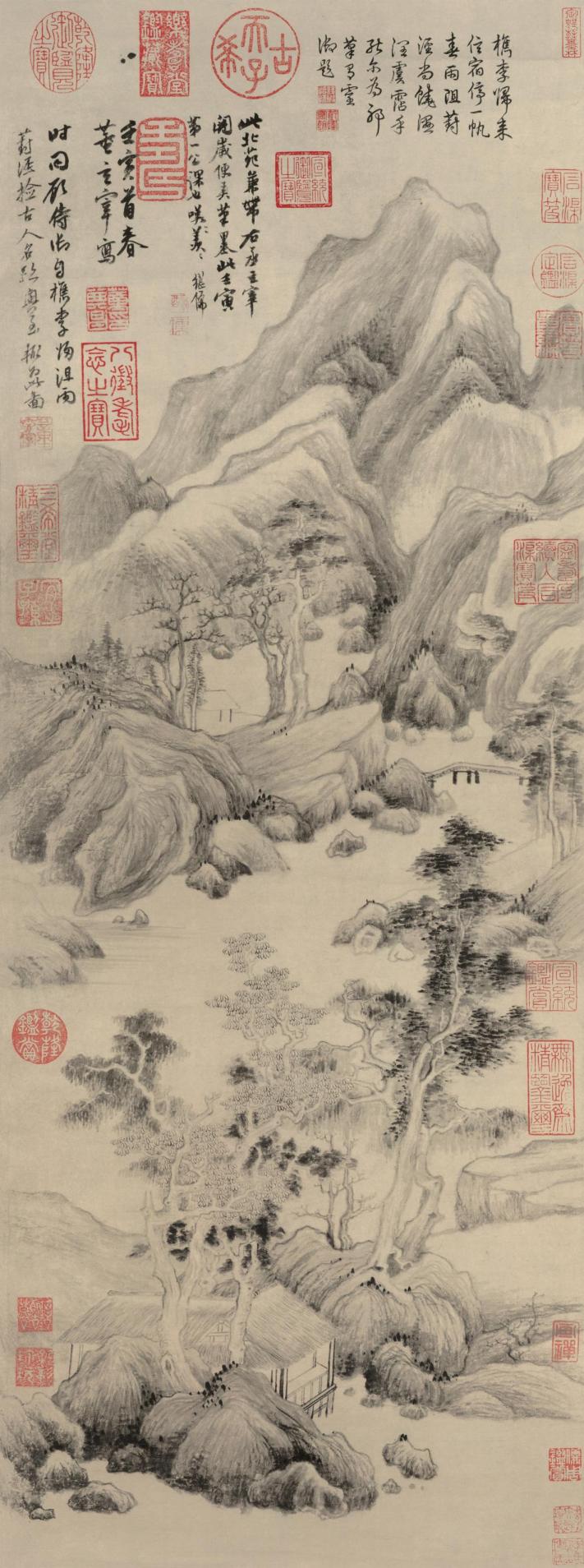 他的设色,也并非浓墨重彩,而是以青绿为主,古朴典雅,与水墨相得益彰,更增添了一份清新的气息。那点缀在山间的青绿,像是春天新生的嫩芽,充满了生机与活力,让人感受到大自然的勃勃生机。