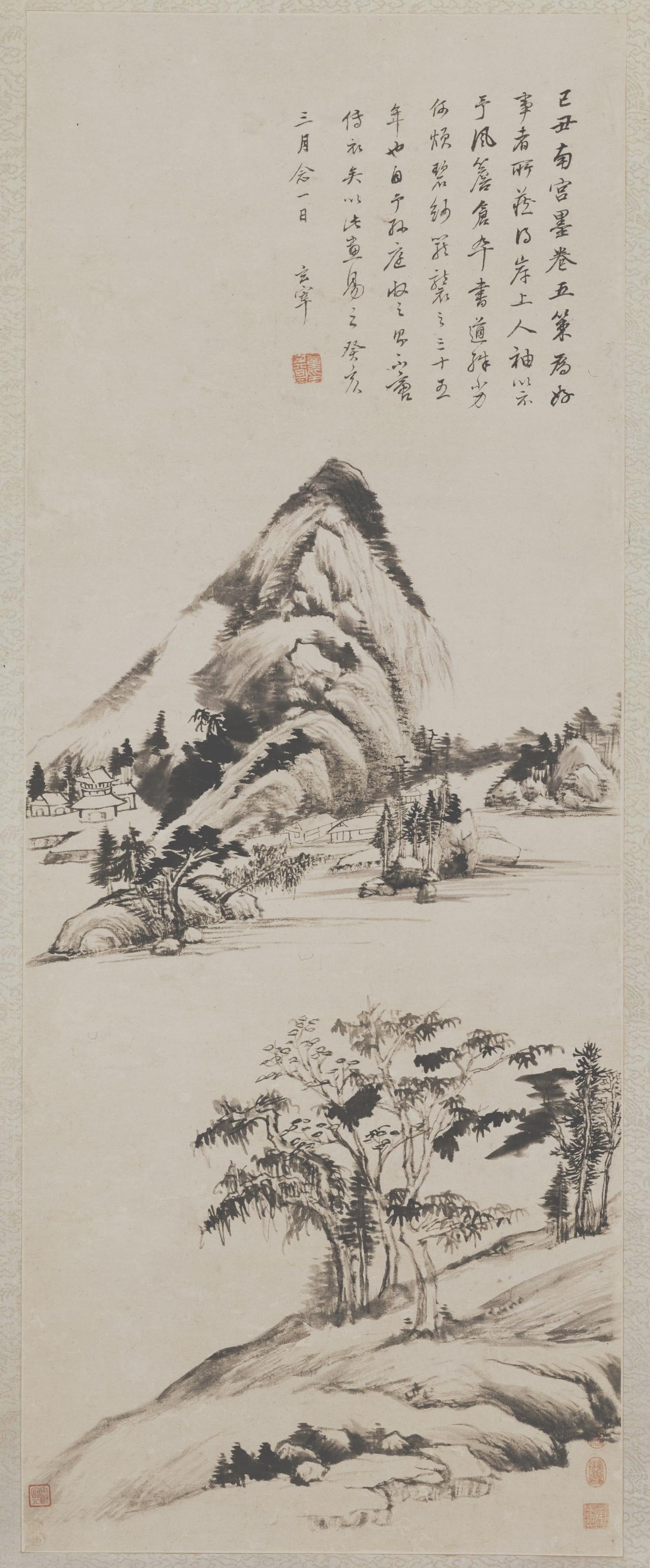 董其昌的用墨,更是妙不可言。他并非追求浓墨重彩的视觉冲击,而是以淡墨为主,轻描淡写,营造出一种清澈透明的意境。墨色的浓淡变化,如同音乐的节奏,时而舒缓,时而急促,引领着观者进入一个空灵的世界。那淡淡的墨色,晕染开来,仿佛云雾缭绕,又像是薄纱轻笼,使画面充满了诗意和神秘感。