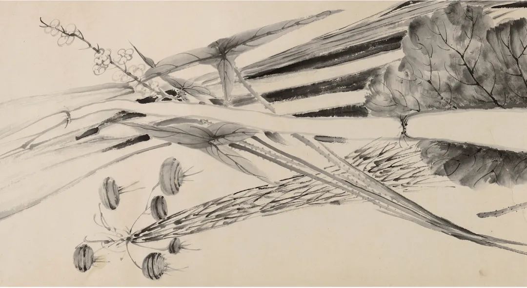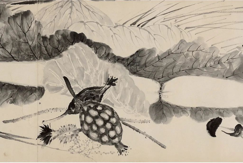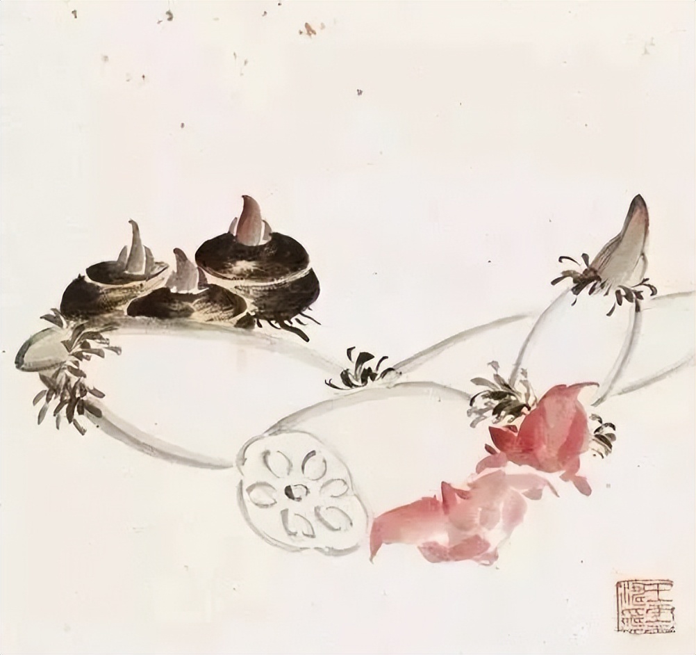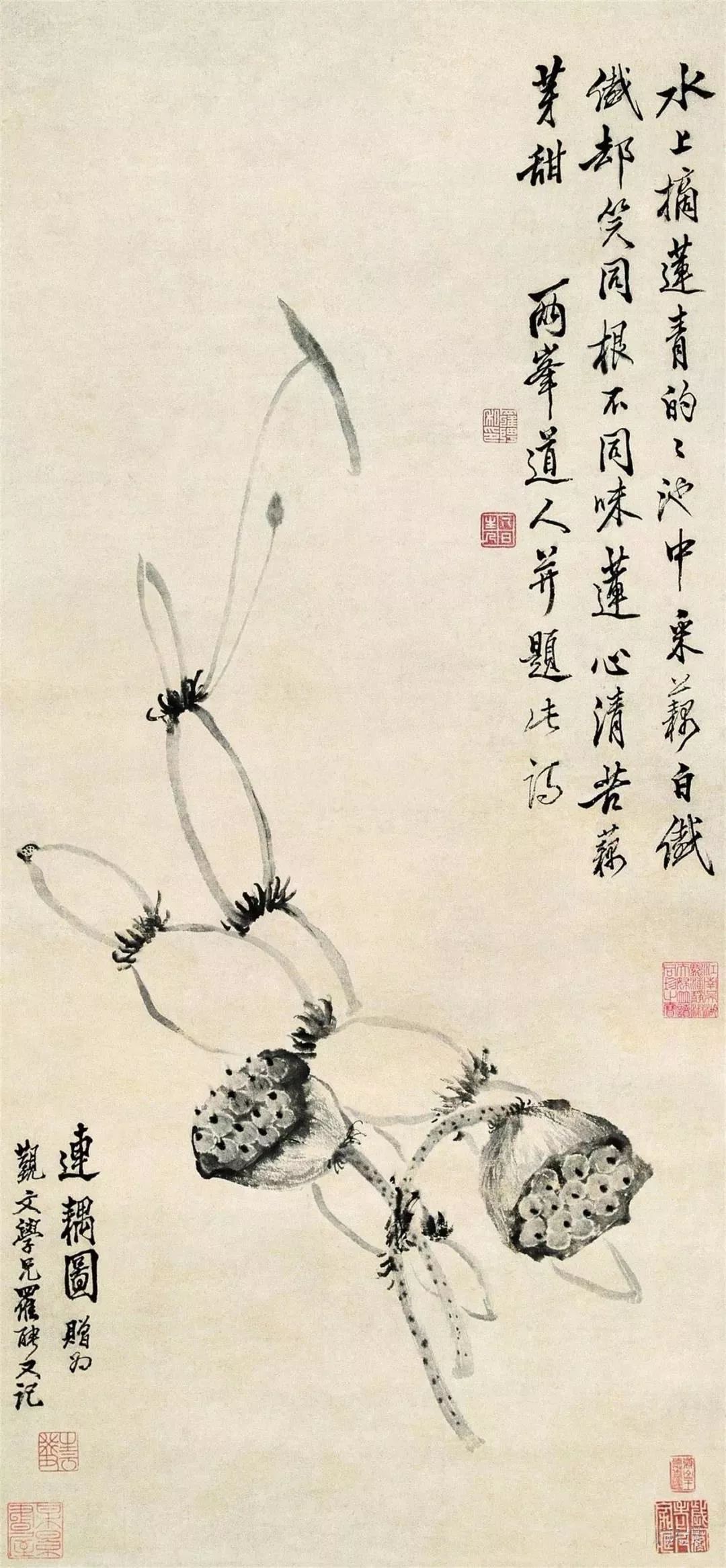 清初的石涛,以其狂放不羁的笔墨,为我们展现了莲藕的别样风情。在《枇杷清藕》中,他以浓淡相宜的笔触勾勒出枇杷的饱满与莲藕的清脆,题诗更是妙趣横生,“无藕不空心”,将莲藕的形态与禅意巧妙结合。而在《莲的心》中,他则以更为细腻的笔触描绘了莲藕的生长状态,那未露先栽的根、已成未开的花,仿佛蕴含着无限的生命力,让人感受到自然造化的神奇。