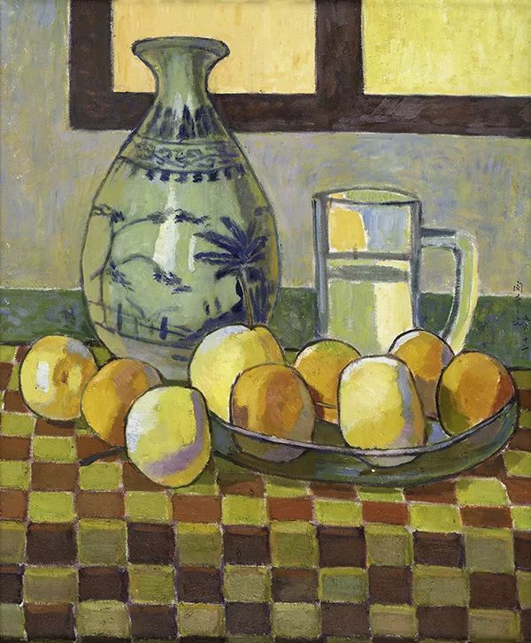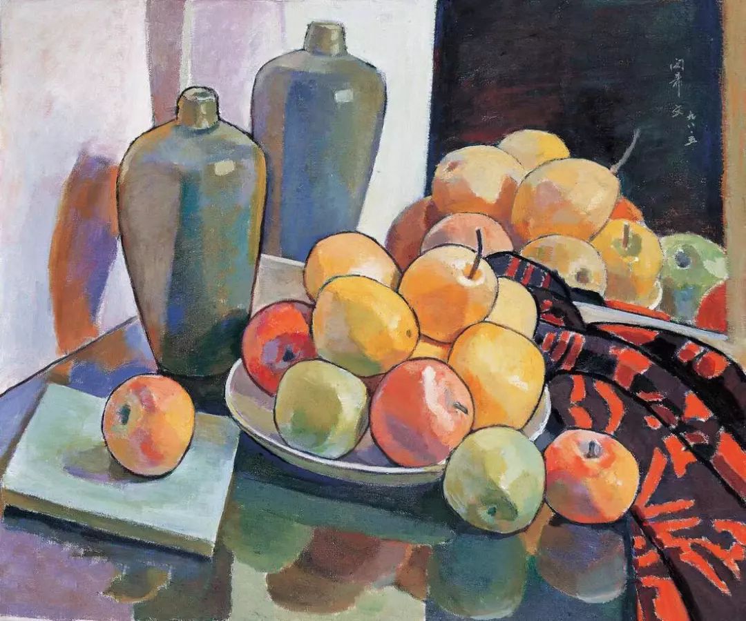 《灰色瓷瓶和水果》中,灰色的瓷瓶与色彩鲜艳的水果形成对比,静谧与活力相互交融,营造出一种独特的和谐之美。《镜子前的静物》则更具哲思,镜子中的倒影,虚实交错,仿佛是对现实与幻境的思考。《花与果》和《桃子与杯》,则以简洁的构图和明快的色彩,展现了生活的美好与宁静。