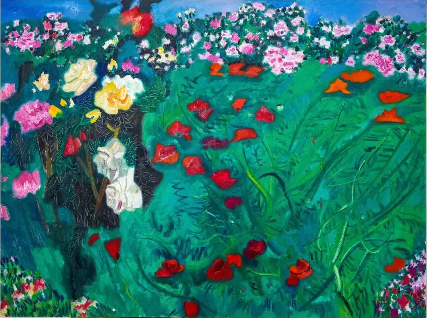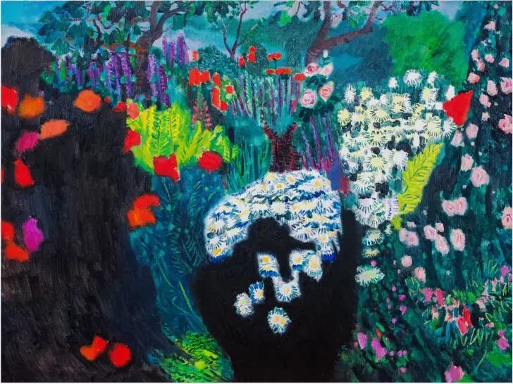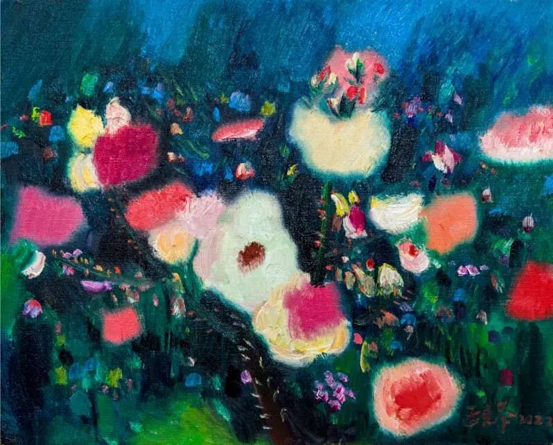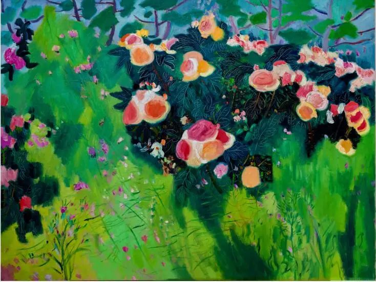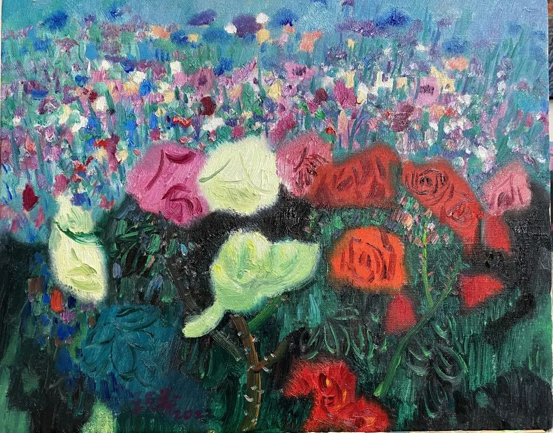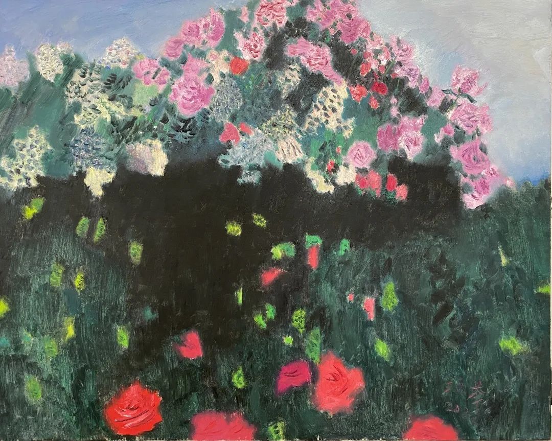 “百花园里看花来”,这标题本身就充满诗意,仿佛邀请我们一同走进这色彩斑斓的世界。120×160厘米的画布上,百花争艳,却不显杂乱。每一朵花都有其独特的姿态,在阳光下舒展着,仿佛能感受到它们蓬勃的生命力。那浓烈的色彩,并非简单的堆砌,而是经过艺术家巧妙的调和,呈现出一种和谐的美感,让人感受到自然界生生不息的活力。