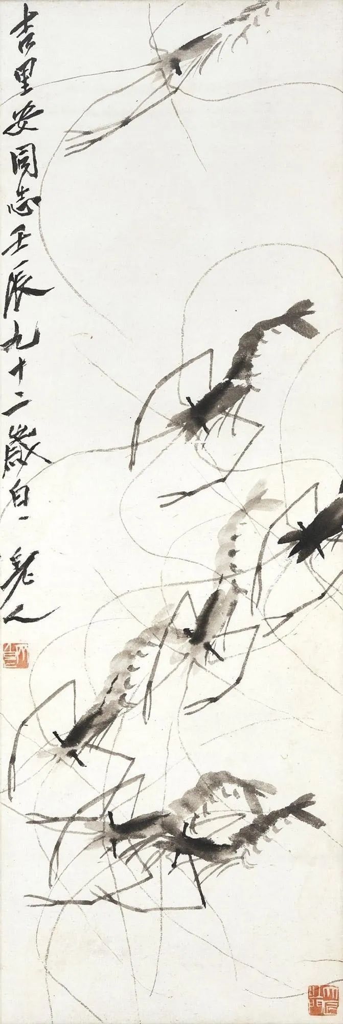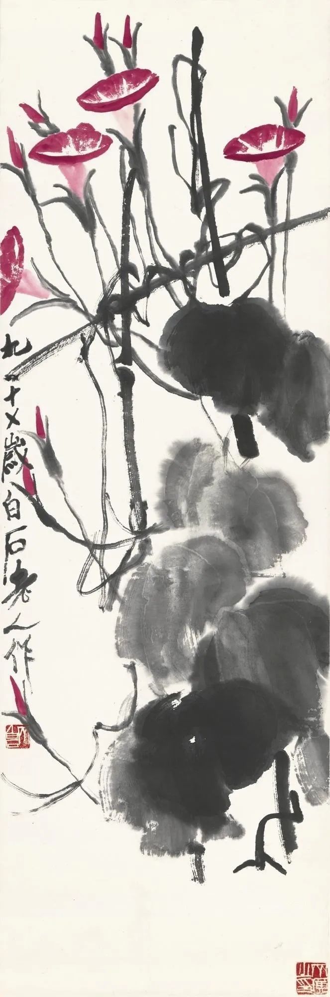 晚年的齐白石,像一株历经风霜却依旧蓬勃的老梅,枝干遒劲,花朵繁盛。九十四岁的高龄,在常人眼中已是颐养天年的时刻,他却依然笔耕不辍,泼墨挥毫,在近二十平尺的巨幅画作上倾注着饱满的激情与活力。中国嘉德2022春拍夜场,齐白石的《嘉耦图》以5520万元成交,这不仅仅是一个数字,更是一首对生命力和艺术创造力的赞歌。