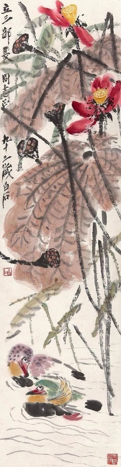 齐白石晚年的创作力令人惊叹,他以荷花、水鸟等题材,创作了一系列精彩绝伦的作品。九十二岁时,他创作的《荷花鸳鸯》,以简洁的构图和鲜明的色彩,展现了荷塘的宁静与祥和;九十三岁时,他又创作了一幅同名作品,尺幅更大,气势更加恢宏;九十四岁时,他创作的《荷花水鸭》,则以更写意的笔触,描绘了水鸭在荷塘嬉戏的场景;九十五岁时,他创作的《荷花鸳鸯》,色彩更加丰富,意境更加深远,堪称晚年杰作。