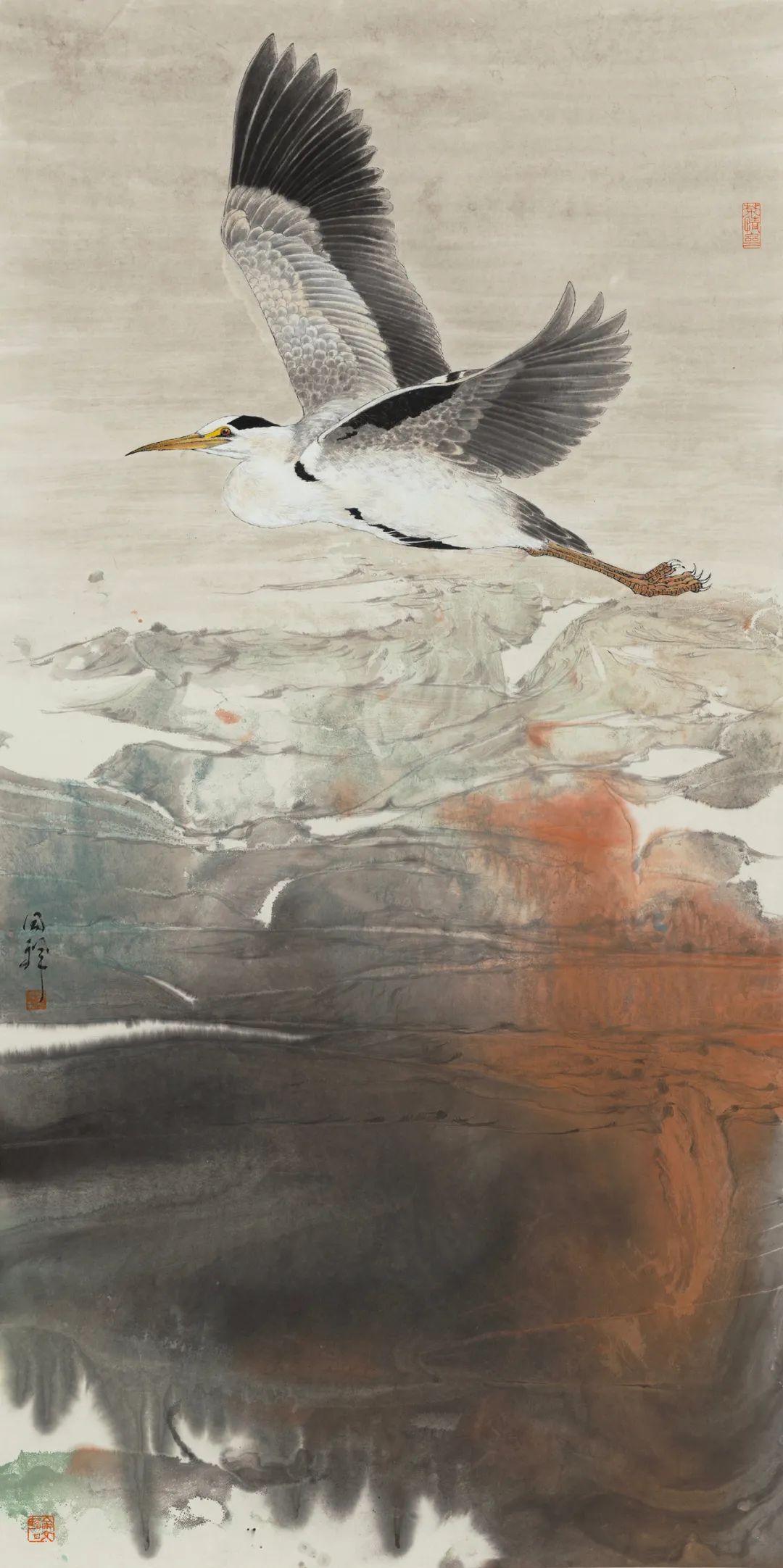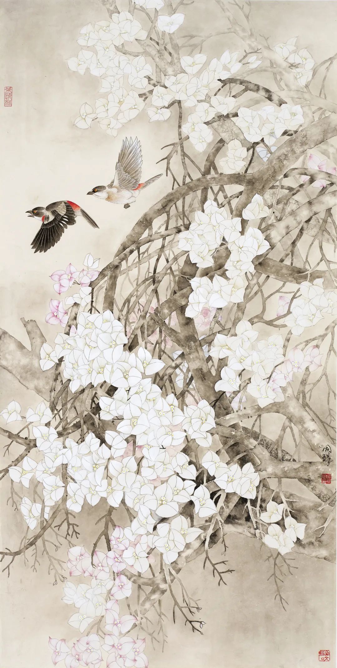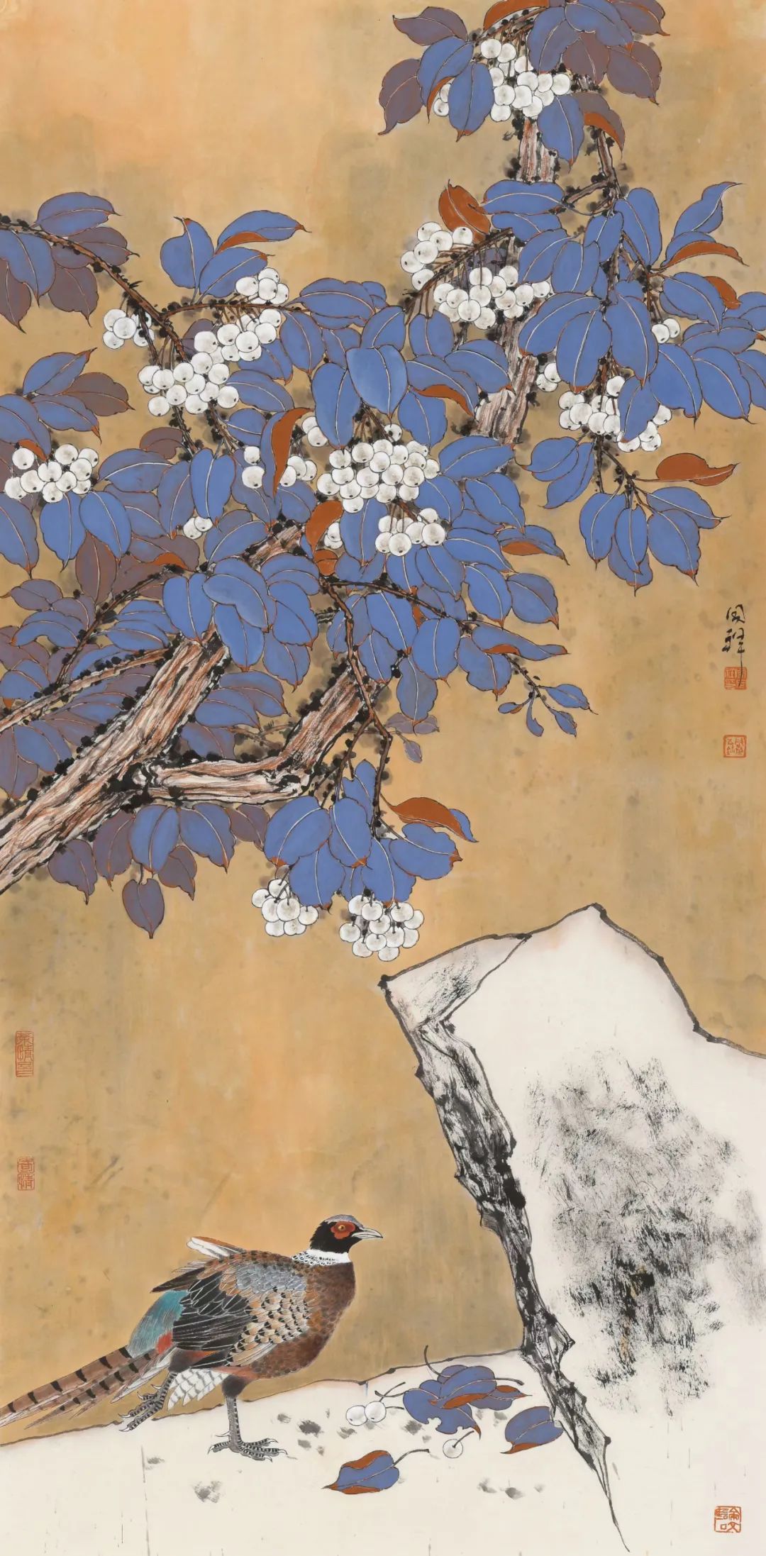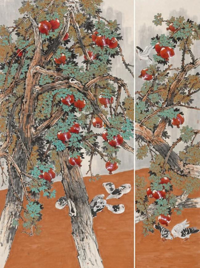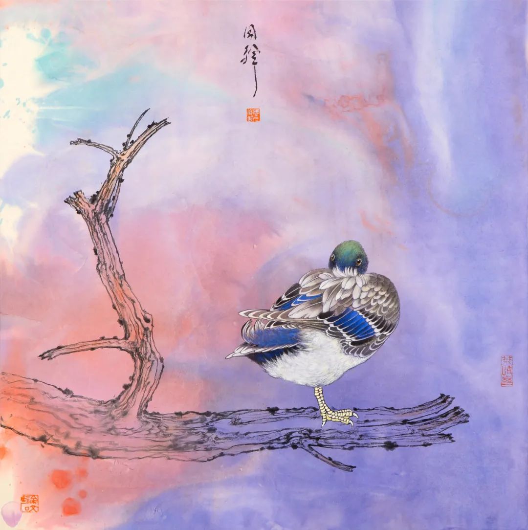 周同祥的花鸟画,则展现出他对自然的热爱与感悟。他笔下的花鸟,或工笔细描,或写意挥洒,都充满了生机与活力。那艳丽的色彩,灵动的线条,仿佛将我们带入了一个鸟语花香的世界。《金秋》中,金黄的石榴,翠绿的枝叶,构成了一幅秋日丰收的景象,让人感受到大自然的馈赠与美好。《掠》与《觅》则捕捉了鸟类捕食的瞬间,将生命的律动展现得淋漓尽致。
