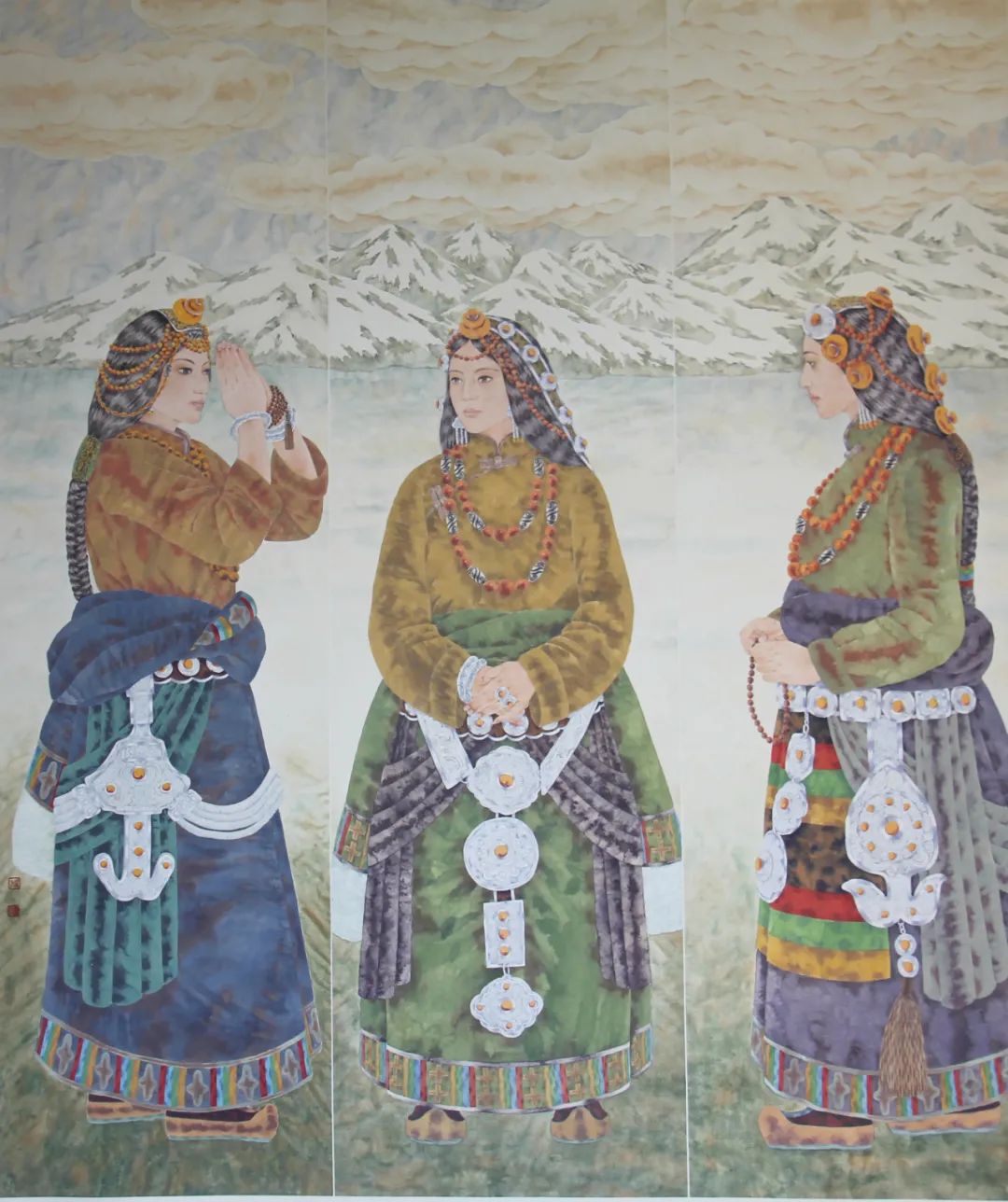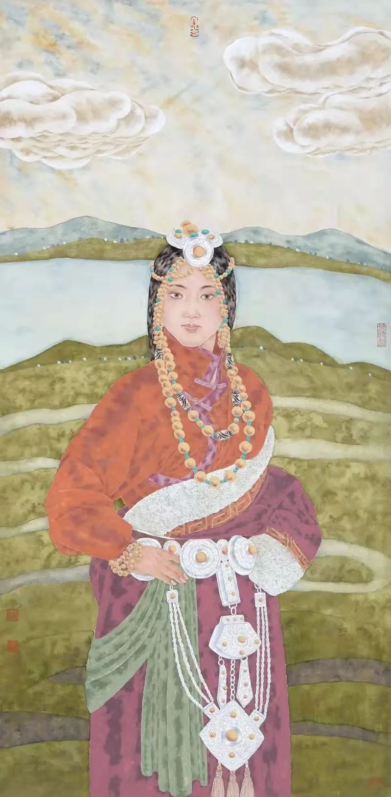 周同祥的人物画尤为动人。他笔下的藏族女性,并非传统印象中的高原红,而是肤色白皙,眼神清澈,流露出真善美的天性。她们身着绚丽的民族服饰,或独辫轻垂,或双辫摇曳,展现出不同年龄段的女性魅力。透过画家的笔触,我们仿佛能感受到雪域高原的纯净与神秘,也能体会到藏族人民的坚韧与乐观。那一幅《圣洁》,将一位18岁的藏族女孩刻画得栩栩如生。女孩端庄优雅,眼神中充满了对未来的憧憬,让人感受到生命的美好与希望。