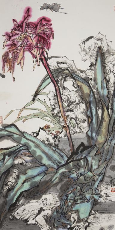 他画中的每一朵花,每一只鸟,每一株草,每一棵树,都注入了浓厚的文化底蕴,强调了“写”与“意”的结合。笔势的美感和墨色的韵致,在画面中营造了近乎抽象的意象之美。那些看似不经意的墨色晕染,如同天成的纹理,展现了画家自由洒脱的创作状态,一种“心游物外,得意忘象”的大气魄。